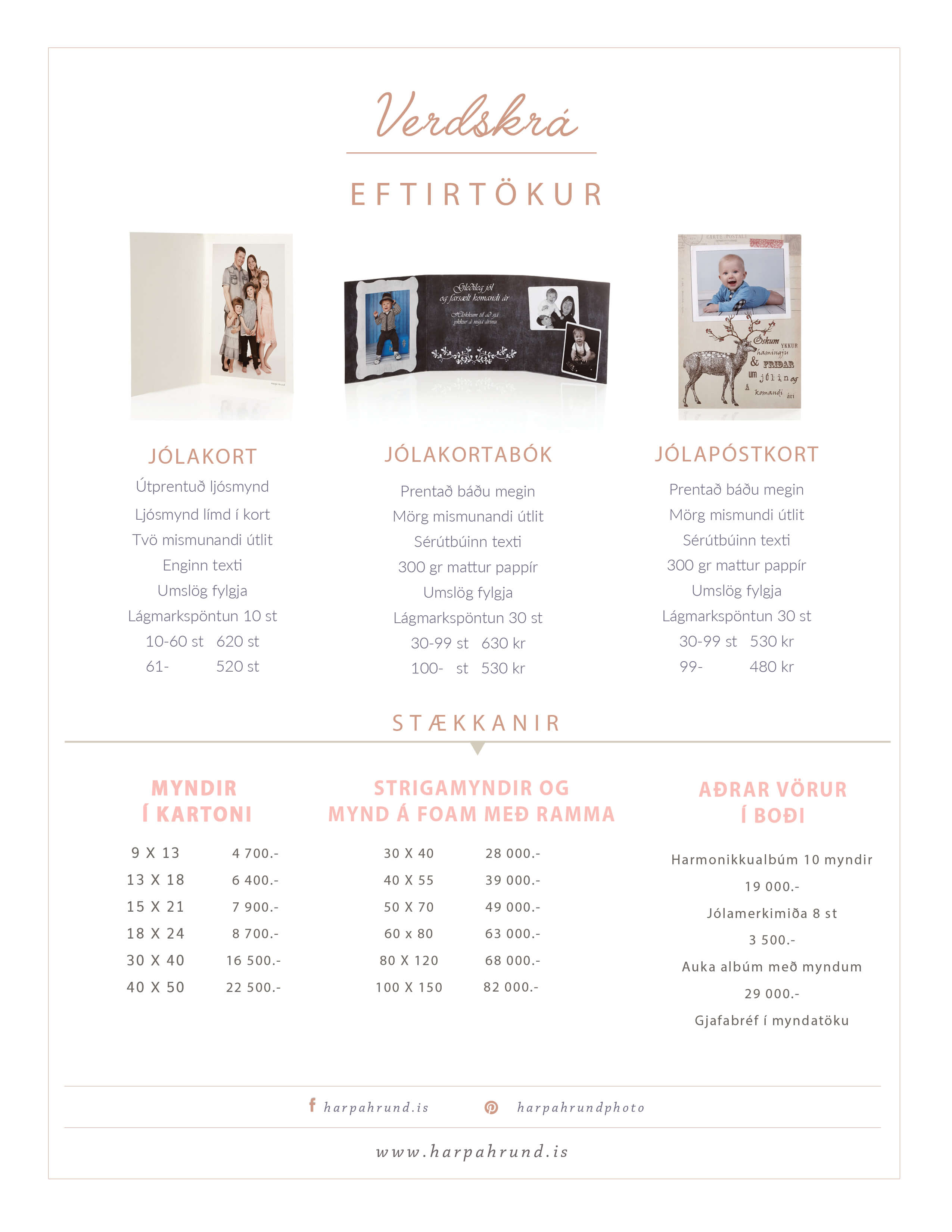 Í grunnverði er hægt að velja um tvær leiðir. Annarsvegar er möguleiki á að fá myndir afhentar í prentupplausn og hinsvegar að fá þær útprentaðar í albúm (albúm 14.000,-). Ef báðir valmöguleikar eru valdir kostar það 5.500, - aukalega fyrir hvert skipti.